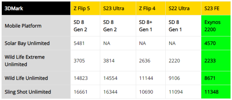 갤럭시S23 FE는 국내 모델 기준으로 엑시노스2200 AP를 탑재하고 있습니다. 긱벤치 5.0 벤치마크 결과에 따르면, 싱글 코어 성능은 1,220점, 멀티 코어 성능은 3,100점을 기록했습니다. 이는 전작인 갤럭시S22 FE(엑시노스2100)보다 약 10% 향상된 수치입니다.