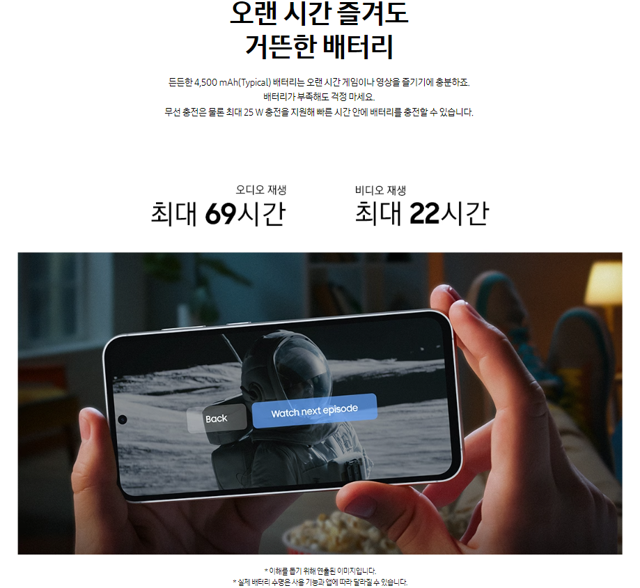 갤럭시S23 FE는 4,500mAh 용량의 배터리를 탑재하고 있습니다. 120Hz 주사율 디스플레이를 탑재했음에도 불구하고, 배터리 효율이 우수하다는 평가를 받고 있습니다.