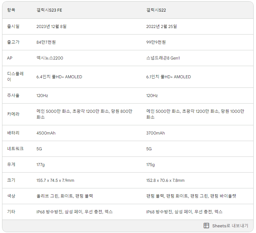 - 가격: 갤럭시S23 FE는 갤럭시S22보다 약 15만원 저렴합니다.