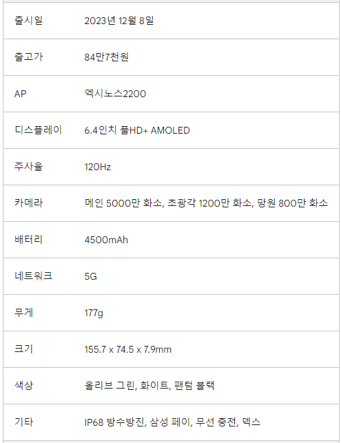 그러나 갤럭시S23 FE는 여전히 풀HD+급 디스플레이, 5천만 화소 메인 카메라, 120Hz 주사율, 무선 충전, 방수 등 플래그십 스마트폰에서 기대할 수 있는 주요 기능을 모두 갖추고 있습니다. 또한, 삼성전자의 최신 보안 업데이트와 A/S 서비스를 받을 수 있다는 점도 장점입니다.