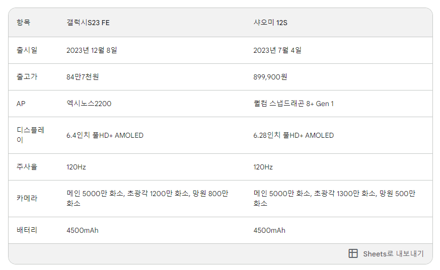 - 갤럭시S23 FE는 샤오미 12S보다 저렴한 가격에 출시되었으며, 디스플레이 해상도가 풀HD+로 조금 더 낮습니다. 반면에, 샤오미 12S는 퀄컴 스냅드래곤 8+ Gen 1 AP를 탑재하여 성능이 더 우수하며, 카메라 성능도 조금 더 뛰어납니다. 또한, 깔끔하고 세련된 디자인을 가지고 있습니다.