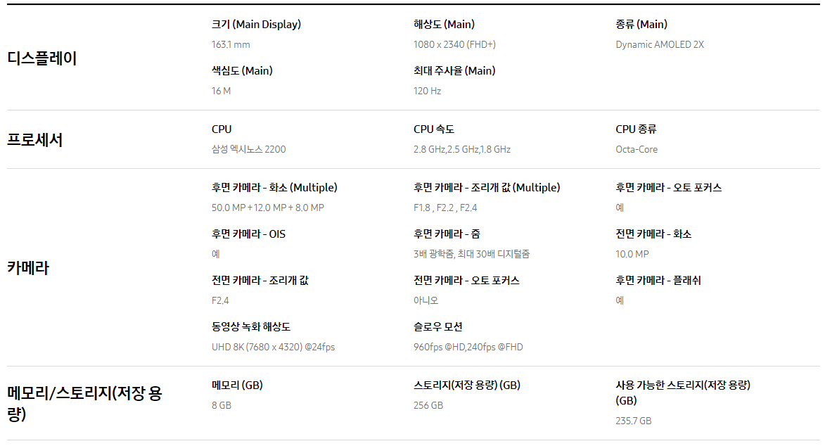 - 우수한 성능: 엑시노스2200 AP를 탑재하여 플래그십 스마트폰에 준하는 성능을 제공합니다.