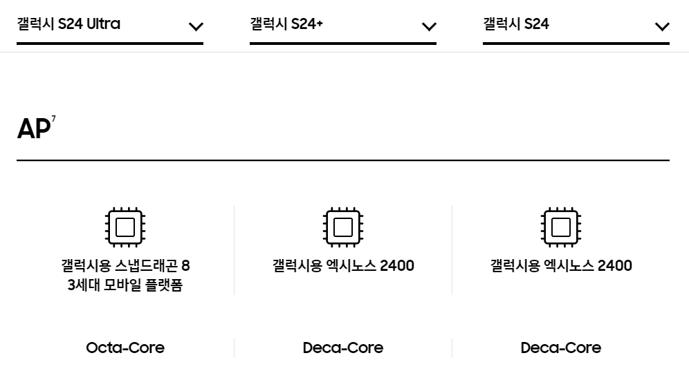 가장 큰 차이는 기본과 플러스 모델에 엑시노스 2400 프로세서가 탑재되었고, 울트라에는 스냅드래곤8 3세대가 탑재되었다는 것인데요.