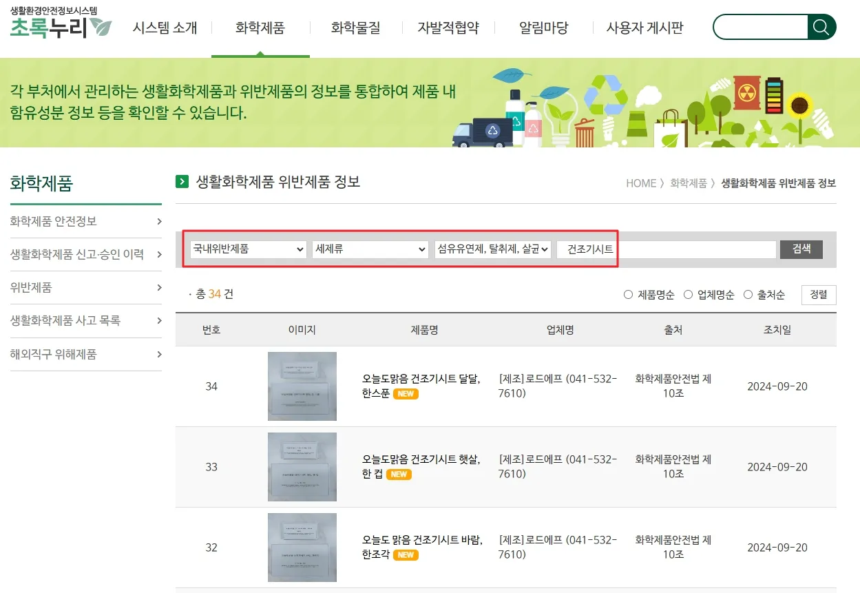 초록누리 웹사이트에 접속하면 회수 명령이 내려진 건조기 시트 제품 목록을 확인할 수 있어요. 제품명, 제조사, 제조일자 등을 꼼꼼하게 비교해 보세요.