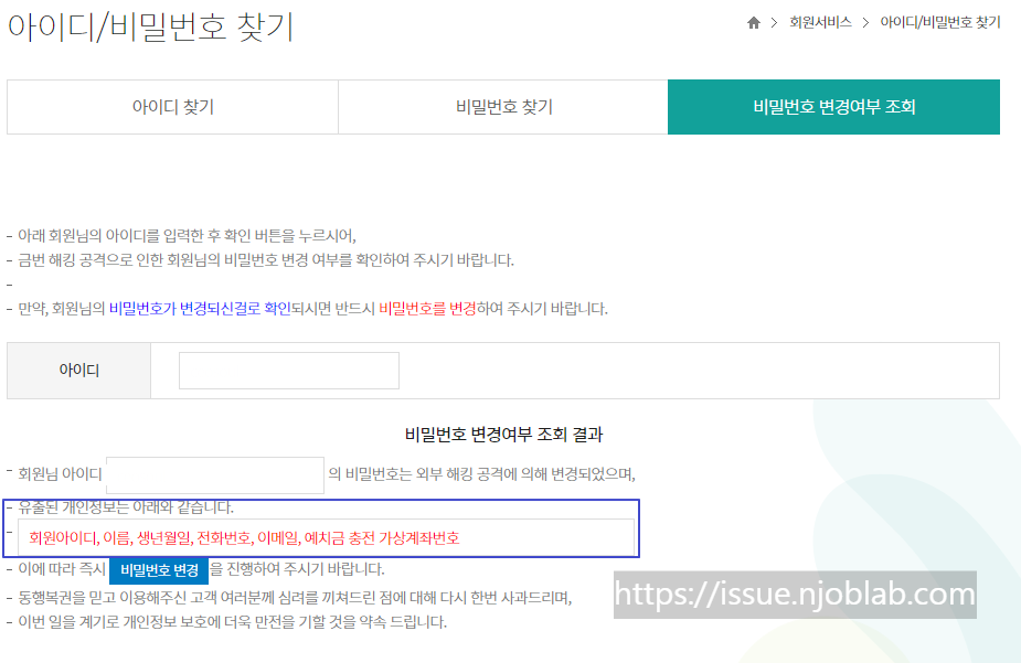 - 해당 페이지에서 아이디, 이름, 생년월일, 전화번호, 이메일, 예치금 충전 가상계좌번호 등 개인정보가 유출된 사실을 확인할 수 있습니다. (아래 사진 참조)