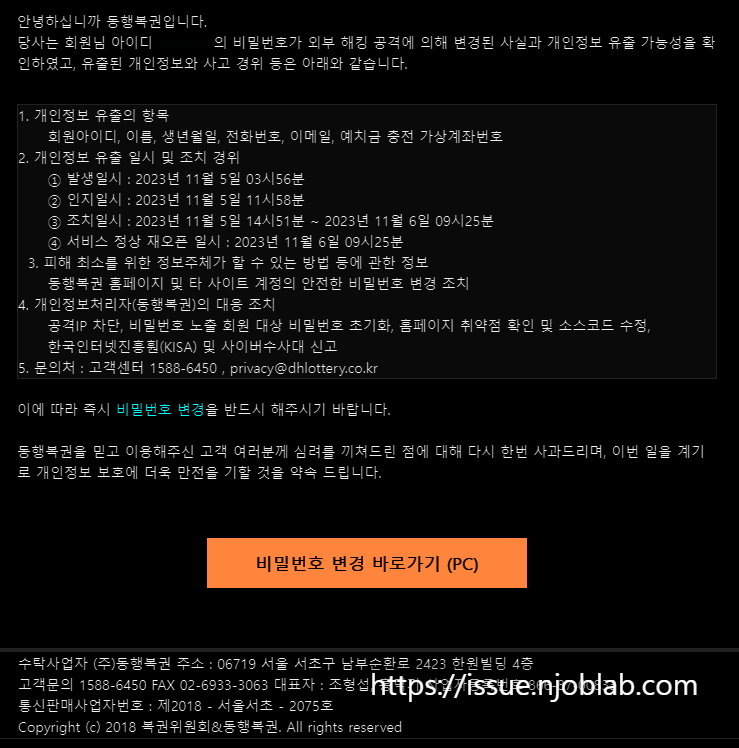 동행복권은 유출된 회원들에게 이메일과 문자 메시지를 통해 개인정보 유출 사실을 알리고, 비밀번호 변경을 요청했습니다. 저도 아래와 같은 이메일을 받아서 비밀번호 변경을 진행했습니다.