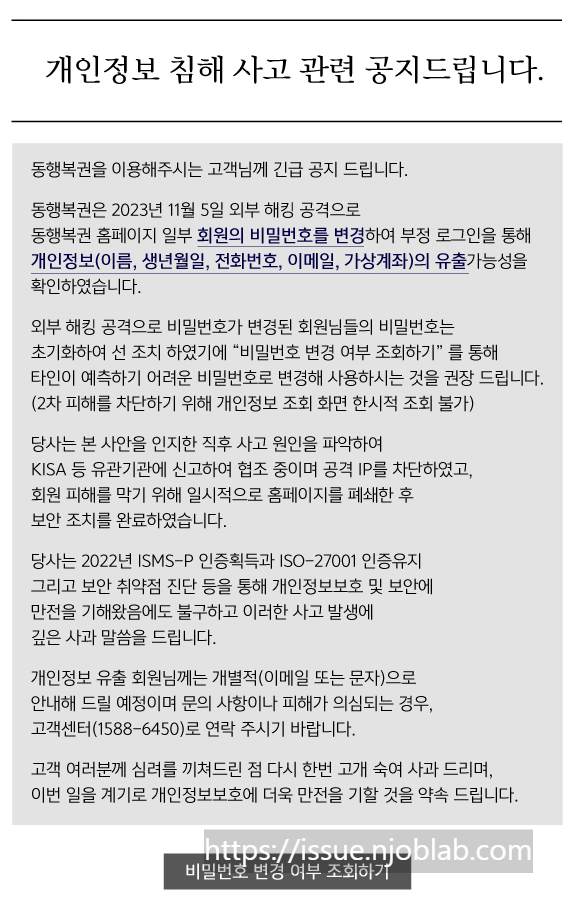안녕하세요! 오늘은 작년말 발생했던 동행복권 개인정보 유출 사건에 대한 후속 조치 방법에 대해 알려드리겠습니다. 동행복권 사이트가 해킹당해 회원들의 개인정보가 유출되었다는 소식을 접하고 이에 대한 대응 방법이 궁금한 분들이 많으실 것입니다. 저는 이 지난번 유출 사건에 대한 상세한 내용과 함께 비밀번호 변경 방법 및 예치금 출금 방법에 대해 안내해 드리겠습니다.