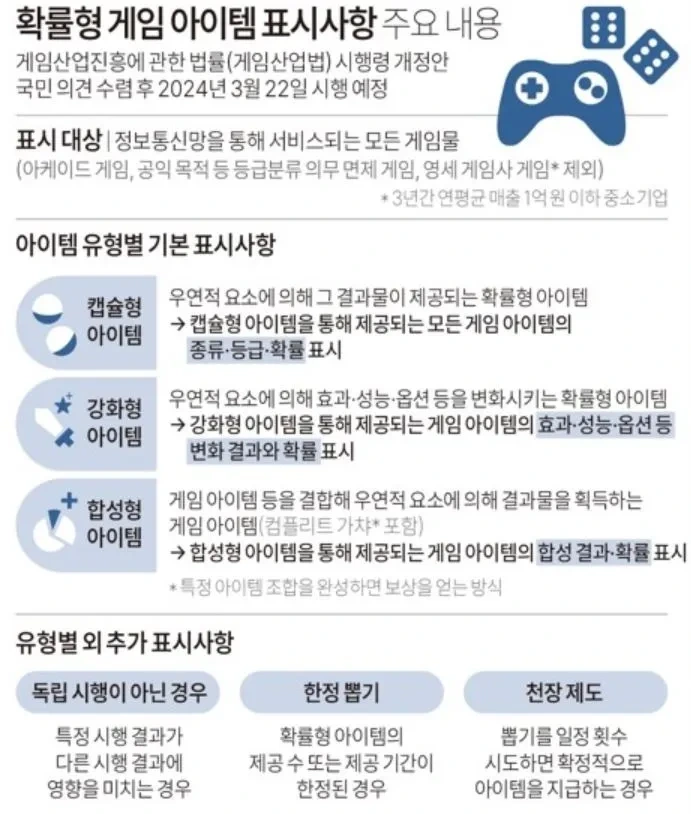 2024년 3월 22일부터는 확률형 아이템에 대한 규제가 강화될 예정입니다. 이에 따라 유저들은 아이템의 확률과 효과를 보다 투명하게 알 수 있게 됩니다. 이번 규제는 확률형 아이템의 카테고리를 세분화하고, 비독점적인 시험 시나리오를 포함하여 보상 조건과 기간 등이 명확히 설정될 것입니다