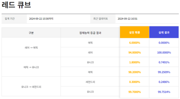 마지막으로, 확률형 아이템의 확률 데이터를 분석해보면, 기대 결과와 실제 결과 간의 차이를 확인할 수 있습니다. 예를 들어, 레드 큐브의 경우 레어에서 에픽으로 변환될 확률과 실제 변환된 결과를 비교한 데이터가 있습니다. 이 데이터는 유저들이 어떤 아이템을 얻을 가능성이 높은지를 파악하는 데 도움을 줍니다.