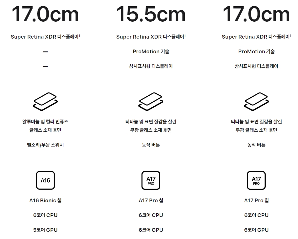 [1] Apple - iPhone 모델 비교하기 (https://www.apple.com/kr/iphone/compare/?modelList=iphone-15-pro-max,iphone-15-plus)