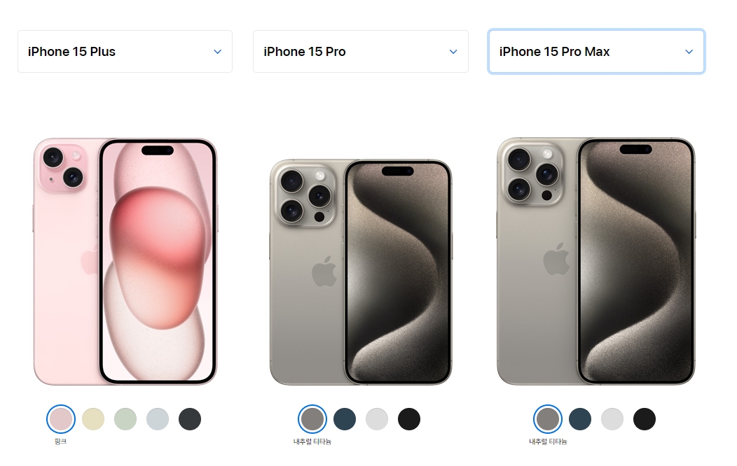- 아이폰 15 프로 맥스: 프로 모델과 동일한 색상 옵션을 제공하여, 고급스러운 느낌을 원하는 소비자에게 인기가 높습니다.