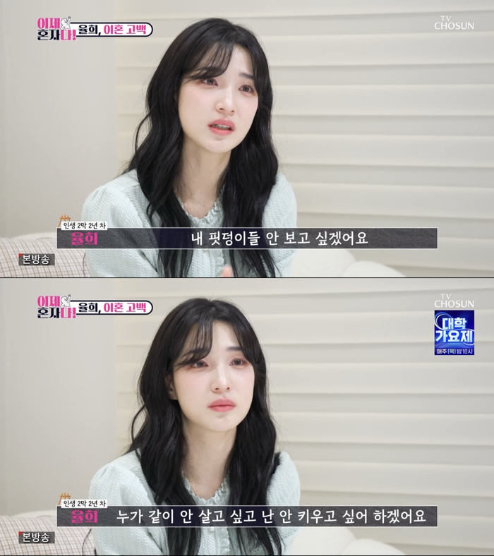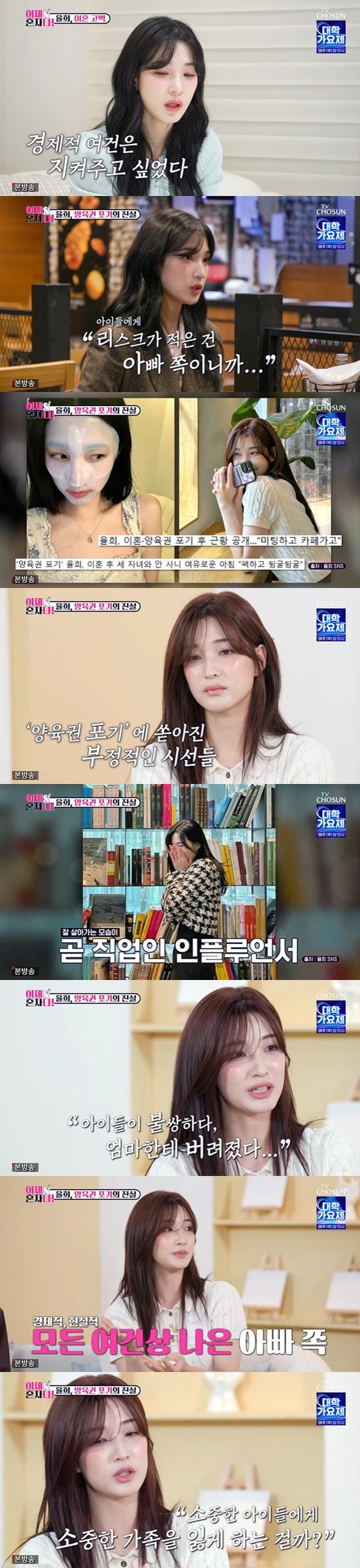 그룹 라붐 출신 율희가 양육권 포기 이유를 밝혔다. 22일 방송된 TV조선 ‘이제 혼자다’에서는 그룹 FT아일랜드 최민환과 이혼한 최연소 아이돌 엄마 율희가 출연해 속마음을 털어놨다. 이날 율