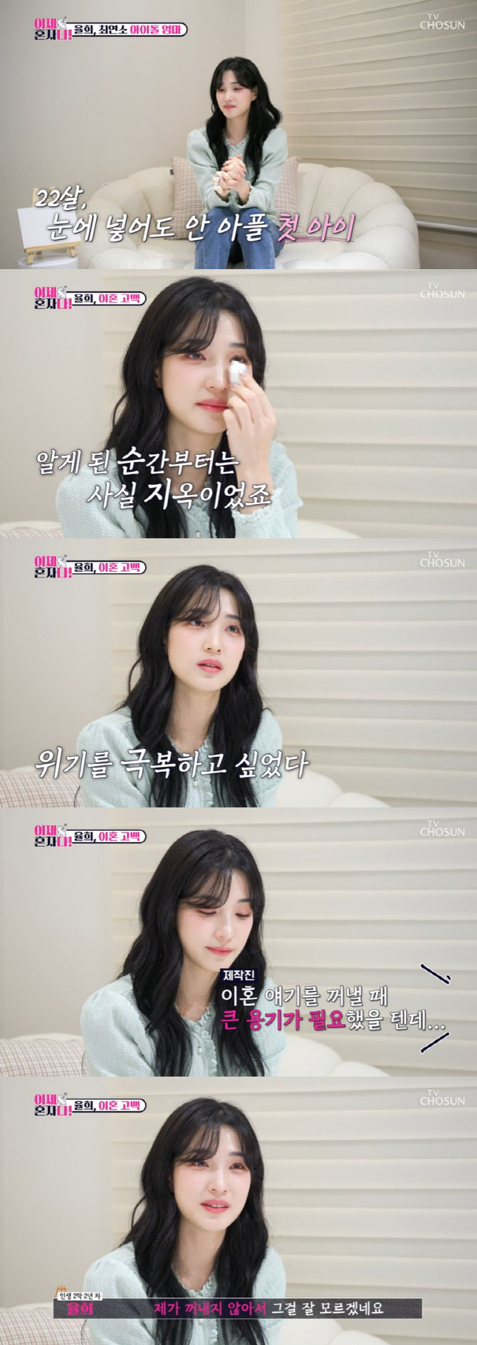 걸그룹 라붐 출신 율희가 최민환과 이혼하게 된 과정을 털어놨다.22일 방송된 TV조선 ‘이제 혼자다’에서는 율희가 출연해 혼자가 된 일상을 공개했다.율희는 제작진과 인터뷰에서 “너무 어릴