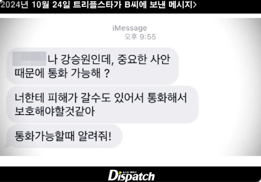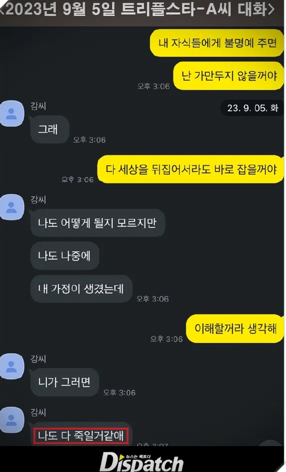 - A씨는 트리플스타가 자신에게 폭언과 협박을 했다고 주장하며 카카오톡 메시지를 공개했습니다.