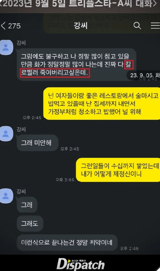 - A씨는 트리플스타가 자신에게 폭언과 협박을 했다고 주장하며 카카오톡 메시지를 공개했습니다.