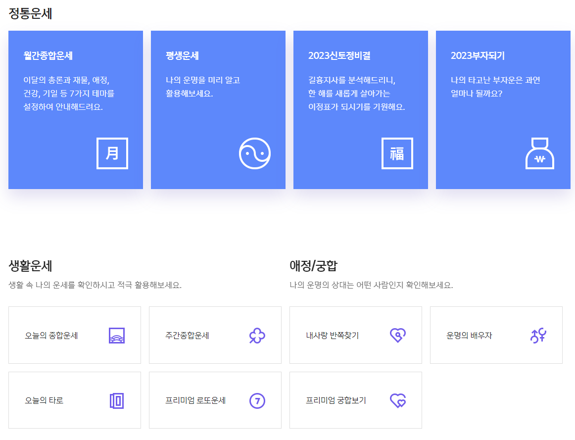 - 각 카테고리별 신년 운세만 나오는 게 아니라 오늘과 내일 모레 글피까지 미래의 운세도 확인 가능합니다.