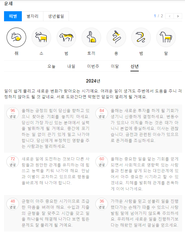 - 2024년 쥐띠,소띠,범띠,토끼띠,용띠,뱀띠,말띠,양띠, 원숭이띠, 닭띠, 개띠, 돼지띠 운세를 확인해보세요.