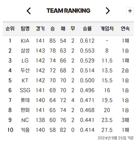 2024 포스트시즌을 앞두고 현재 정규시즌 팀 순위는 다음과 같습니다: