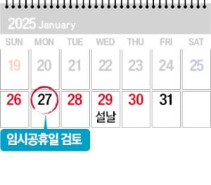 [1] 한겨레 - 연차 1개만 쓰면 9일 연휴?…1월27일 임시공휴일 지정 검토 (https://www.hani.co.kr/arti/politics/politics_general/1176811.html)