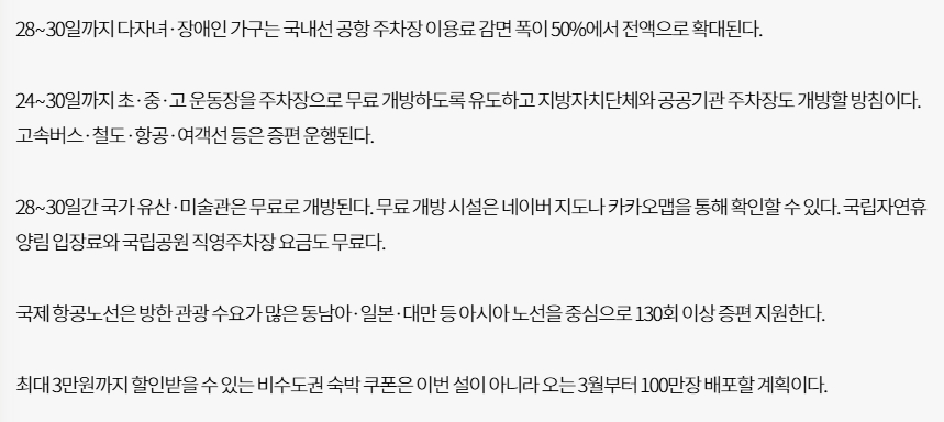 - 공공주차장 무료 개방 : 설 연휴 동안 공공주차장이 무료로 개방됩니다.