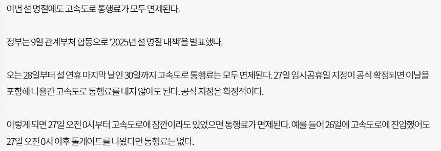 - 고속도로 통행료 면제 : 2025년 설 연휴 기간 동안 고속도로 통행료가 면제됩니다.